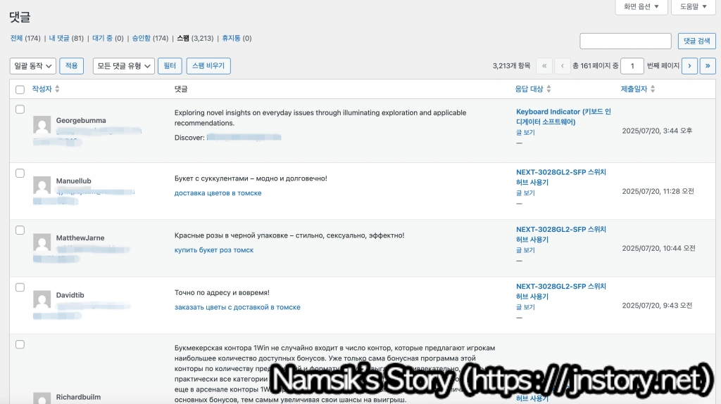 티스토리는 카카오가 스팸 댓글 필터링을 제공하기 때문에 사용자가 별도로 스팸 댓글을 관리할 필요가 없습니다. 반면, 워드프레스는 Advanced Google reCAPTCHA(WP Captcha)와 같은 CAPTCHA 기반 스팸 댓글 방지 플러그인을 적용하지 않으면 대량의 스팸 댓글이 게시될 수 있습니다. 필자는 Advanced Google reCAPTCHA(WP Captcha) 플러그인을 사용해 스팸 댓글을 차단하고 있으며, 그 성능에 매우 만족하고 있습니다.