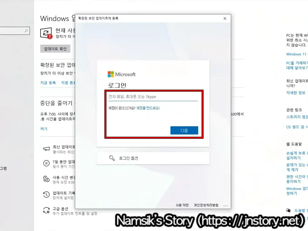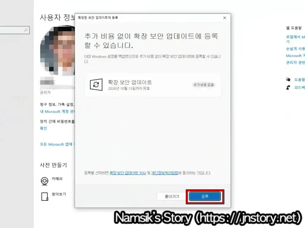 Windows 10 운영체제의 설정 → 업데이트 및 보안 → Windows 업데이트로 이동한 후 확장된 보안 업데이트에 등록 섹션에서 [지금 등록]을 선택하고 나타나는 안내 창에서 [다음]을 선택해 Microsoft 계정으로 로그인합니다. 단, Microsoft 계정으로 로그인하면 로컬 계정이 Microsoft 계정으로 변경되므로 공용 컴퓨터에는 확장된 보안 업데이트 등록을 하지 않는 것을 추천합니다.