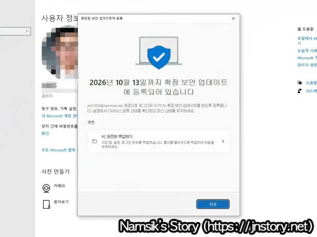 Microsoft 계정으로 로그인이 완료되면 앞서 언급한 것처럼 로컬 계정이 Microsoft 계정으로 변경되며, 별도의 추가 절차 없이 [등록] 버튼을 선택해 확장 보안 업데이트 프로그램에 등록할 수 있습니다. 확장 보안 업데이트 프로그램에 등록을 완료하면 Windows 업데이트를 통해 긴급 및 중요 보안 업데이트를 제공받아 시스템을 보다 안전하게 유지할 수 있습니다.