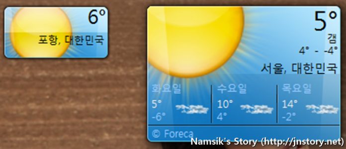 Windows 7에는 기본적으로 '날씨'라는 가젯이 포함되어 있습니다. 그렇지만 한국을 지원하지 않는 날씨 가젯은 사용자에게 무용지물일뿐입니다. 그렇다면 아래의 링크를 클릭하여 새로운 가제을 내려받아 설치해주세요!...