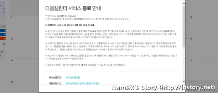 다음카카오는 지난달 23일 공지사항을 통하여 일정, 알림 등을 기록하는 다음 캘린더 서비스를 오는 9월 1일부로 종료한다고 공지하였습니다. 기존에 다음 캘린더를 이용하던 고객은 일정...