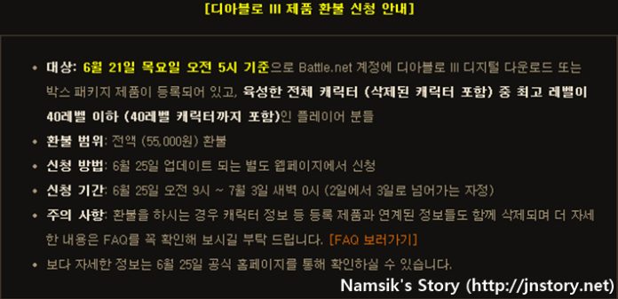 지난 2012년 05월 많은 기대를 품고 출시된 디아블로3는 배틀넷 접속지연, 백서버문제로 많은 이용자의 불만 폭주로 인해서 이용자 일부에 대해서 전액환불을 실시한다고 합니다. 당초, 블리자드에서는 환불은 불가능하다고...