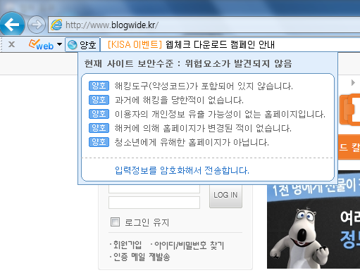 웹체크는 이용자가 특정 홈페이지를 접속하면 한국인터넷진흥원에서 구축한 데이터베이와 연동하여 해당 홈페이지의 국가 정보, 악성코드 은닉여부, 개인정보보호 암호화 여부등을 툴바를 통하여 안내해주며, 해킹신고/PC원격점검신청/툴바클리너/인터넷클리너와 같은...
