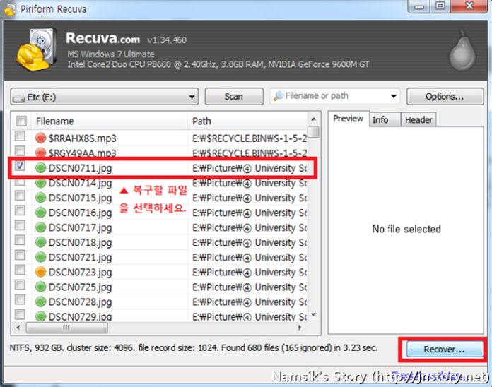Recuva를 이용하시면 이미지, 음악, 동영상등의 파일을 매우 쉽고 간편하게 복구할 수 있으며, 파이널 데이터 2.0에 비해서 사용방법이 간단하고 시간소요도 적게되기 때문에 꼭 추천해드리고...